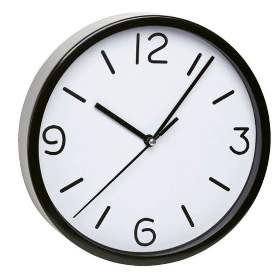 Clock. The clock is round in shape with dimensions φ230 x 40 mm. Made with a black PVC frame and a glass cover that is a secure protection for the internal mechanisms.