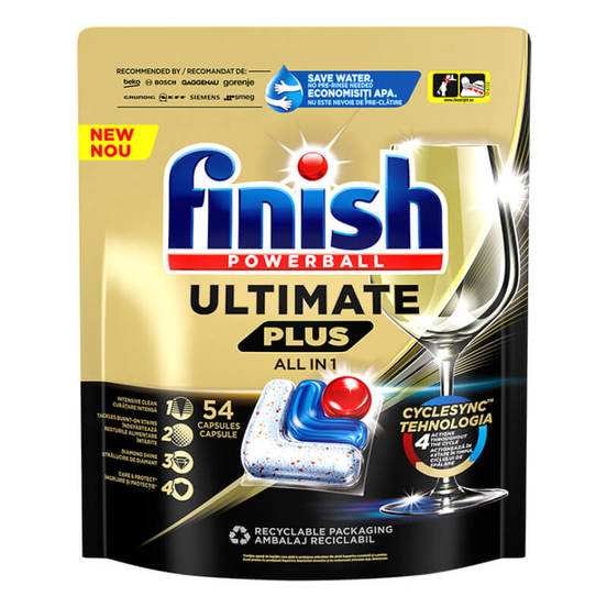 Capsules for dishwasher 54 pcs. Ultimate Plus of the brand FINISH. The capsules guarantee intensive cleaning and a perfect shine of the dishes. These are the first capsules based on CYCLECYNC technology that release the right ingredients at the right time in the wash cycle. With its advanced technology, the capsules remove even the hardened food on the dishes, without the need for pre-rinsing, acting in 4 different stages during the washing cycle. The tablets carefully protect glasses and utensils, keeping their shine from wash to wash.
