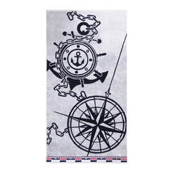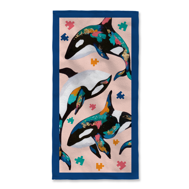 The beach towels have a graphic front and a white back. The images on the beach towels are made with harmless and sustainable dyes.