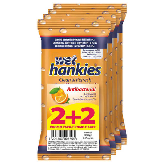 Wet wipes of the brand WET HANKIES. Antibacterial, orange scented. They are available in a promo set of 2+2 packages of 15 pcs.