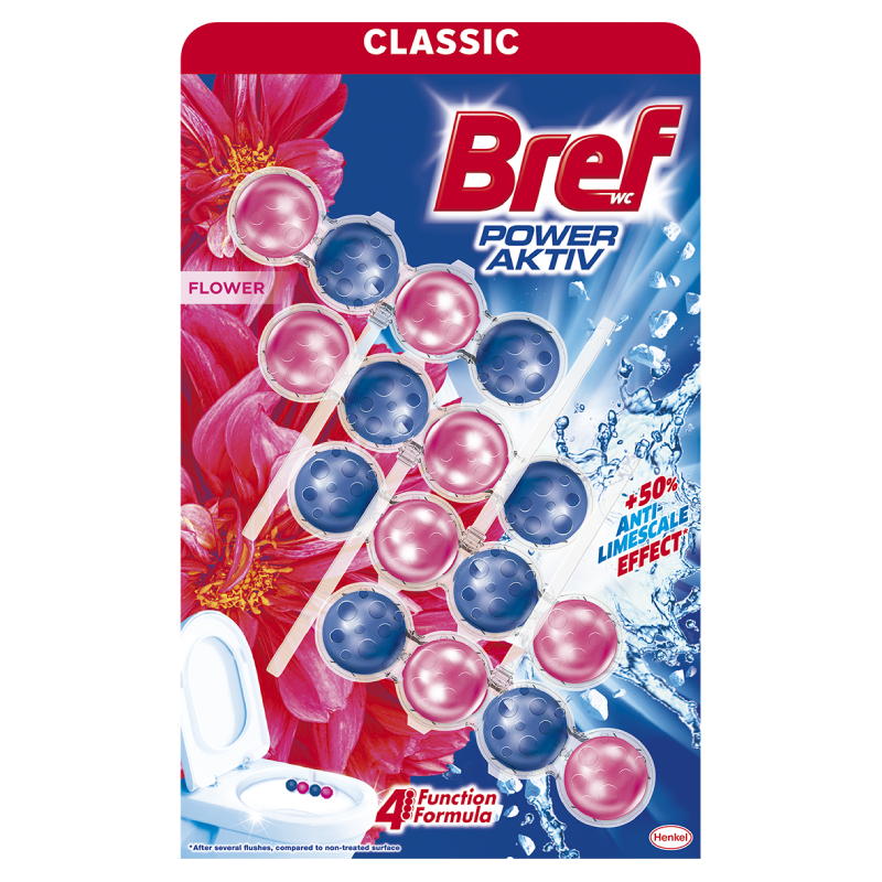 Toilet bowl fragrance in the form of Power Aktiv balls of the brand BREF. 3 pieces of 50 g. With a fresh aroma of flowers. They are available as a liquid substrate concentrated in 4 balls. They feature a 4-functional formula providing hygiene, protection against limescale, freshness and cleansing foam.
