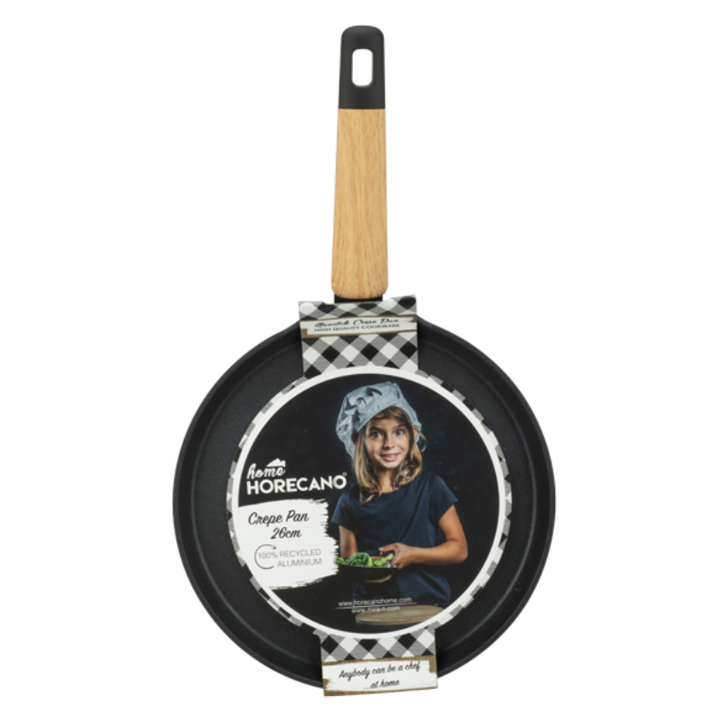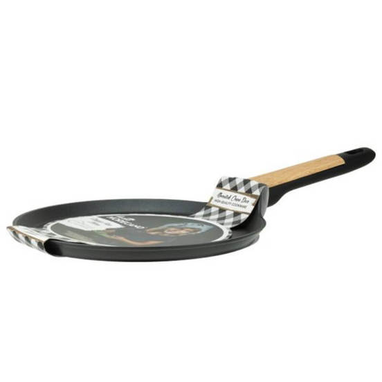 Aluminum pancake pan 26 x 1.7 cm black and wood.