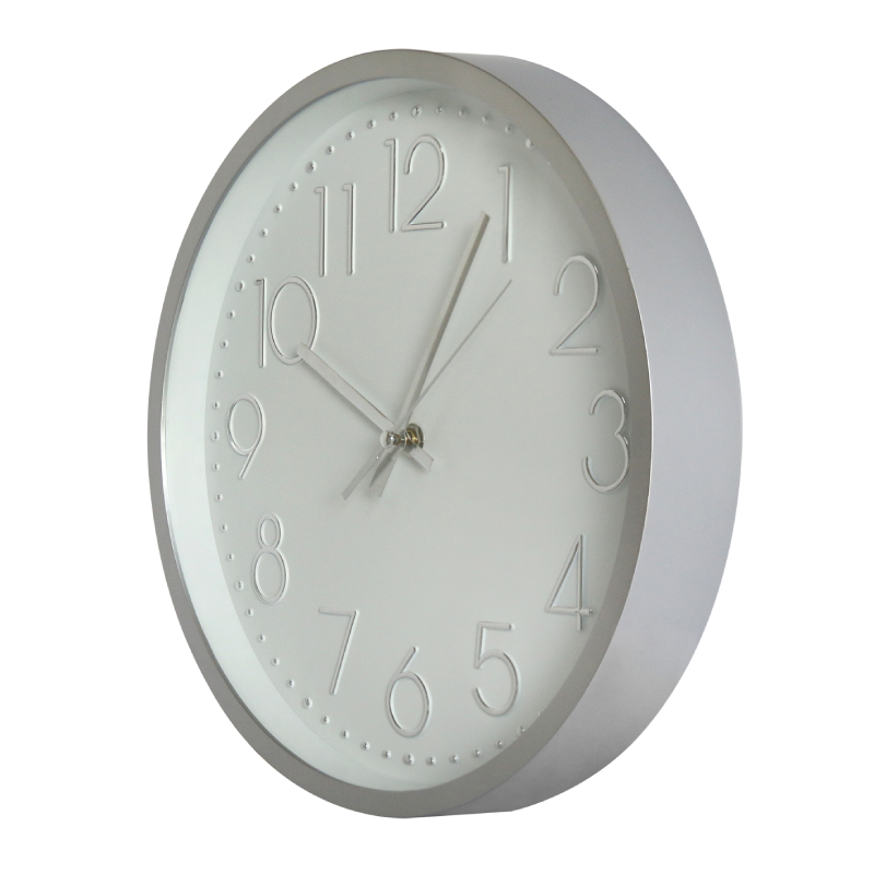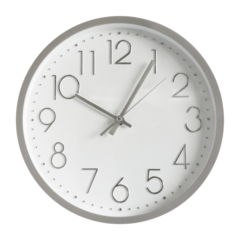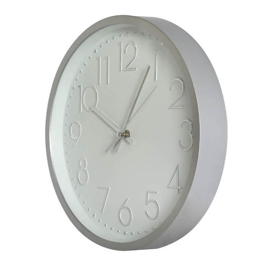 Wall clock. Diameter: 30 cm. Material: plastic. Design in silver. Silent.
