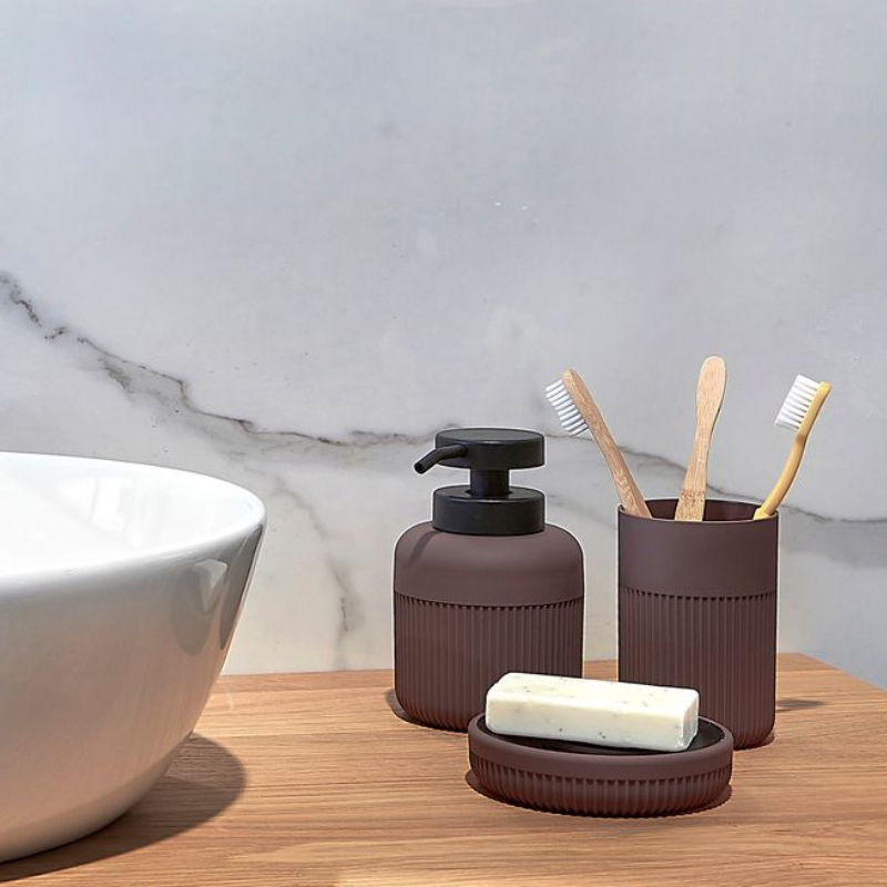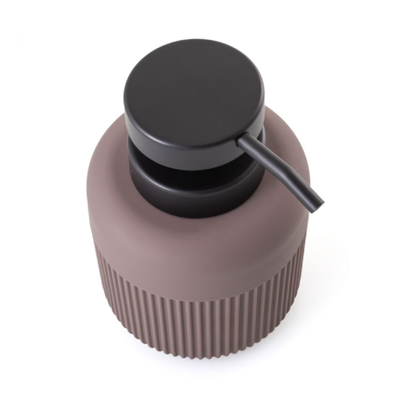 The soap dispenser from the Loreto series in an exclusive, muted shade of plum purple is a real decoration for the bathroom. Its large capacity of 450 ml ensures long-term use without the need for frequent refilling of soap. Made of matte plastic, the dispenser has an elegant appearance, and the decorative grooves give it an exceptional aesthetic. The black, wide dosing pump beautifully complements the plum purple color, giving the entire accessory a harmonious and extremely modern look.