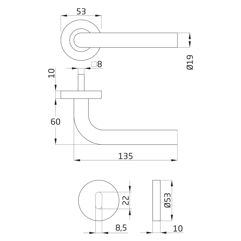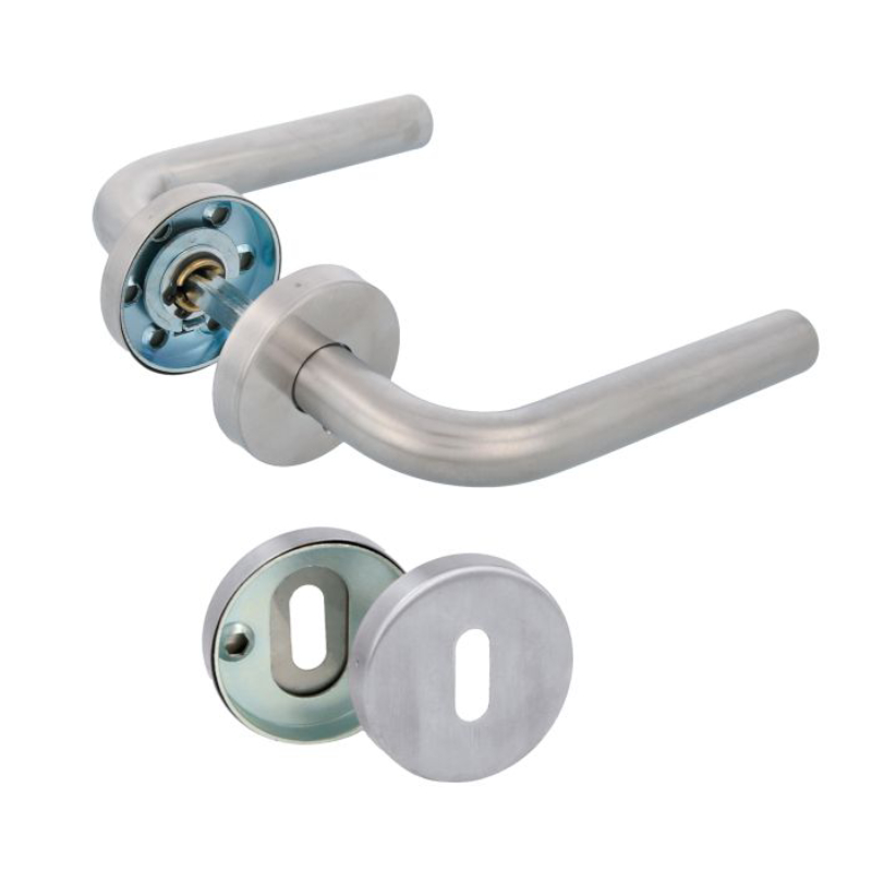 Stainless steel handle set. With an internal rosette made of nickel-plated steel. 8 mm square spindle. Includes key holes for a security key. The models in the collection have a modernist design and compact dimensions. They are made of high-quality stainless steel. They are equipped with a spring that ensures the return of the handle to the horizontal position and with through-bolts through the door leaf.