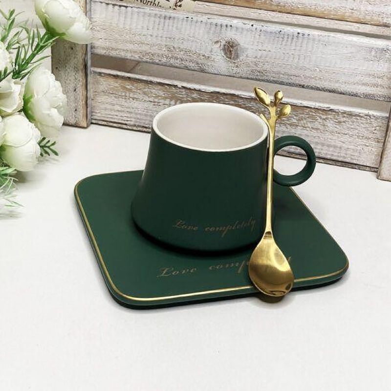 The porcelain cup from the GREEN LOVE COMPLETELY series is a real jewel for any serving, combining elegance, color and practicality. The set includes a cup with a capacity of 160 ml, a stylish square saucer with a golden edge, as well as a porcelain spoon, which create a feeling of sophistication and attention to detail.
