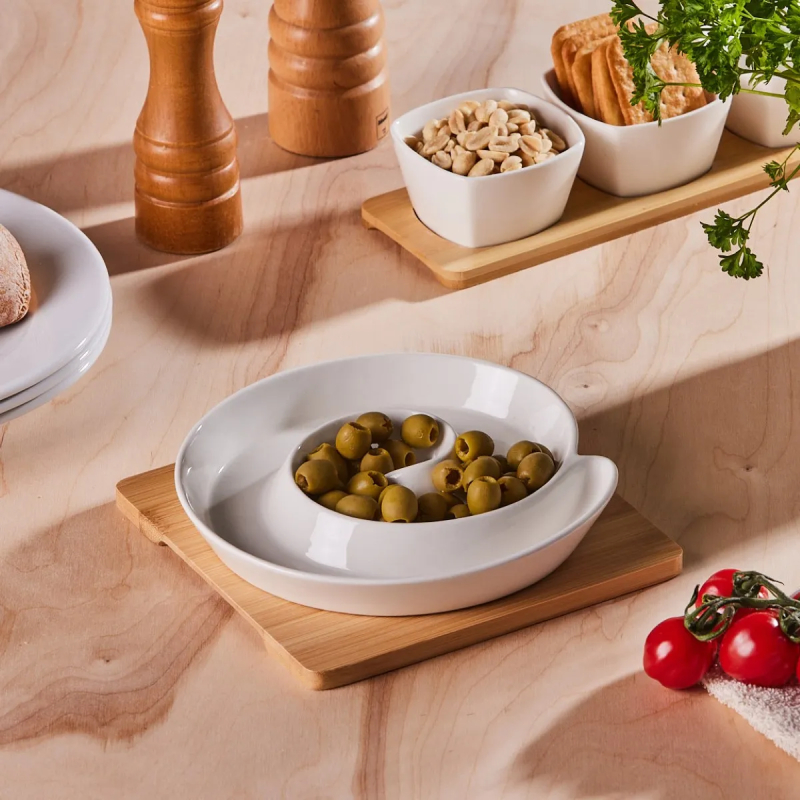 The shape with compartments allows for serving different types of food at the same time - from nuts and sauces to fruits, without mixing flavors. The bamboo mat is environmentally friendly, stable and easy to maintain, and the platter itself can also be used independently.