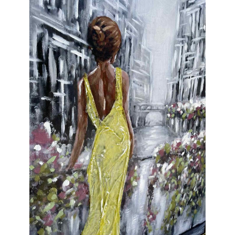 "City Melody in Yellow" is an elegant and highly impactful painting that combines femininity, style and the dynamism of the urban landscape. The woman, dressed in a long yellow dress, stands out as a sunny accent among the gray and beige shades of the city. Her bright look creates an expressive contrast and inspires a sense of freedom, confidence and modern aesthetics.