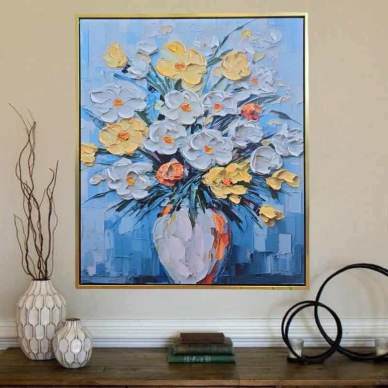The painting "Vase with Flowers" is a cheerful and harmonious composition that brings a feeling of light, warmth and positive energy. The floral elements are depicted in a balanced palette of blue, white, yellow and orange, which complement each other and create dynamism and freshness. The colors are reminiscent of a sunny summer day and bring mood and life to any space.