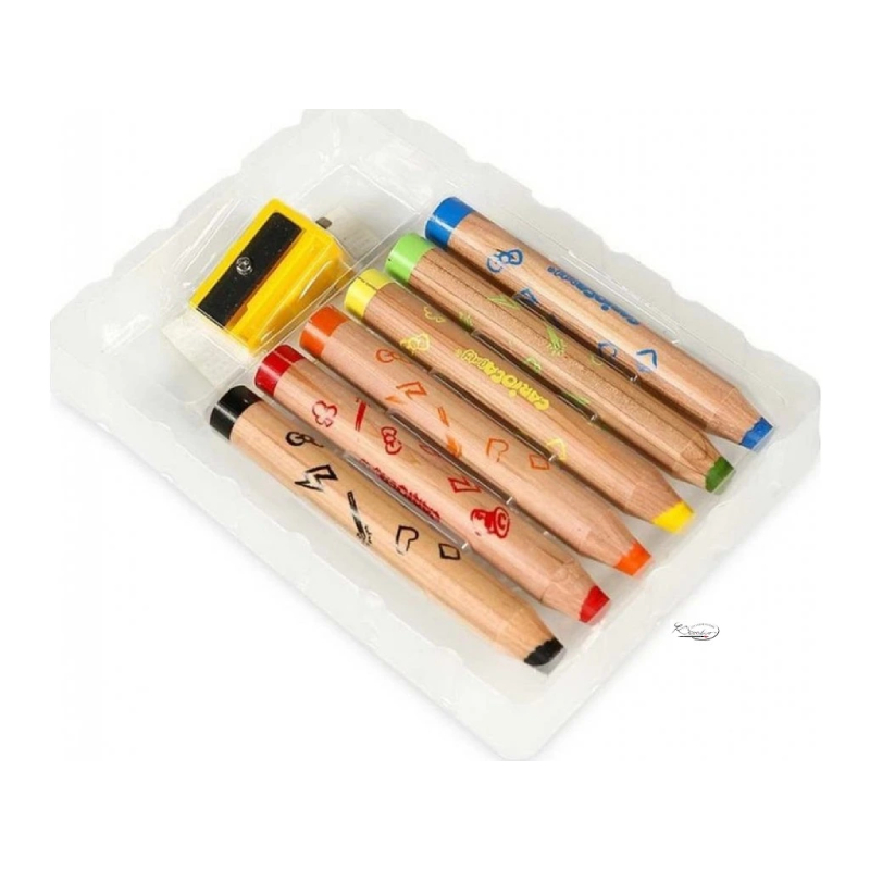 The pencils have a large diameter (10 mm) for easy grip and control by little hands, which helps develop fine motor skills. The included sharpener allows for maintenance of the tips for optimal use, and the safe rounded tip and easily washable pigments make the set suitable for children over 1 year old.