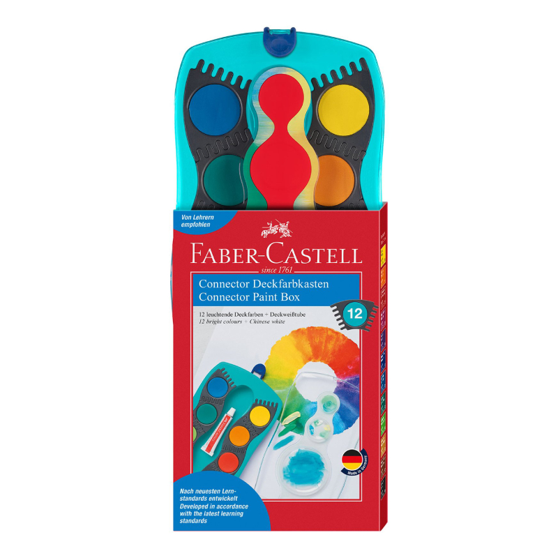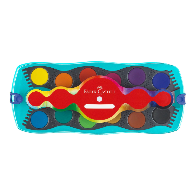 Faber-Castell Connector watercolor paints in a set of 12 colors (turquoise base) feature an innovative design that turns drawing into a game. Each color is placed in a separate removable box that can be used alone or connected with others, forming different combinations and shapes - like a real watercolor constructor. This makes the product suitable for children who learn colors and their mixing in a fun way, and also makes it easier to organize and carry the paints.