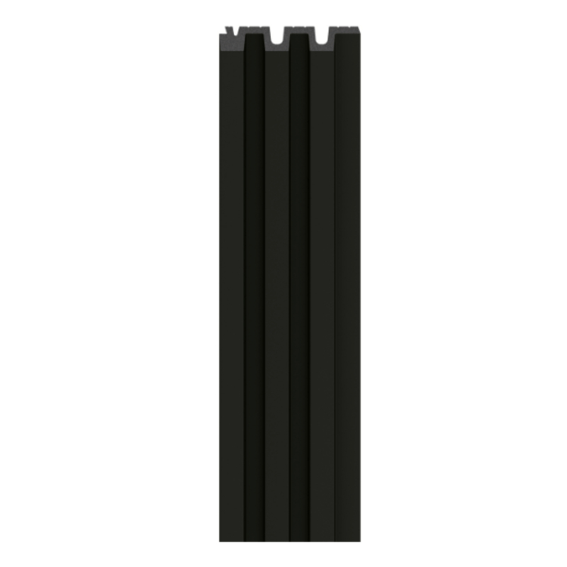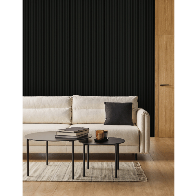 VOX Linerio M-Line Plus lamella panel in black. The panel is made of polystyrene, with a three-dimensional structure that gives depth to the wall and improves the acoustics in the room. Lightweight, moisture-resistant and easy to install with glue - a practical solution for home and office.