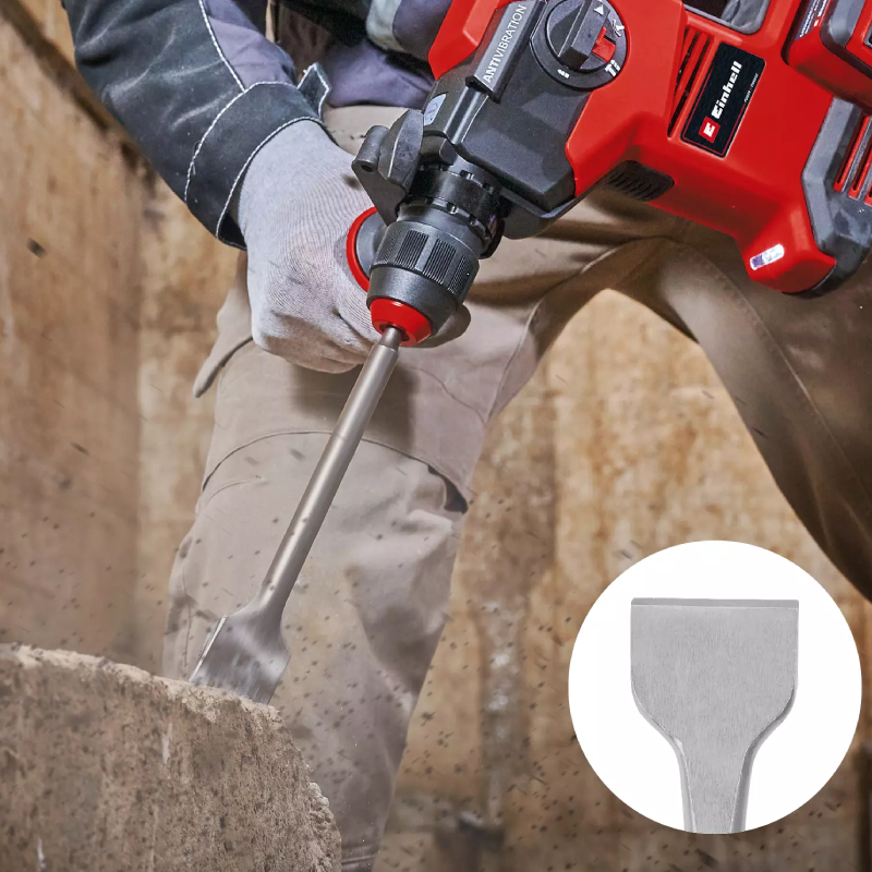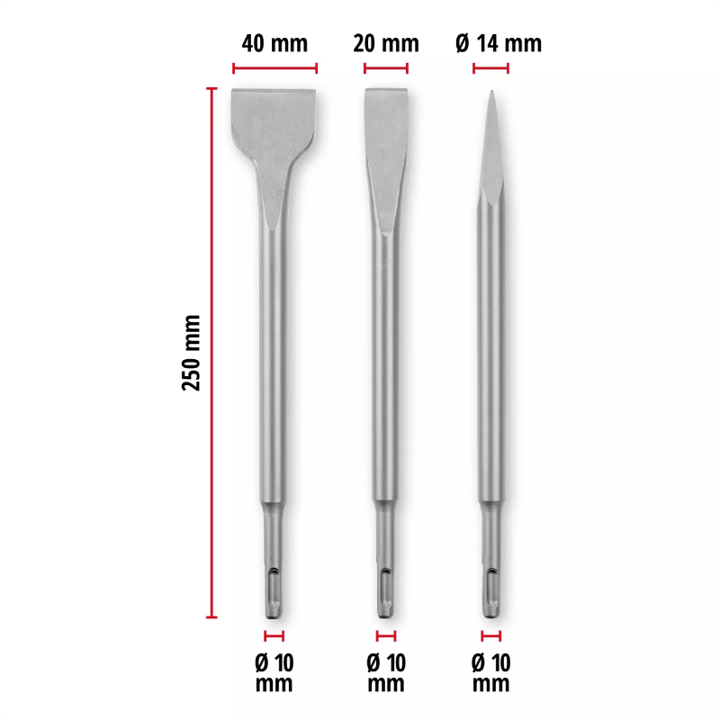 The EINHELL chisel set includes three high-quality tools suitable for a variety of applications in demolition and dismantling. Made of robust 40Cr tool steel, the chisels ensure reliability and a long service life. Thanks to the SDS-Plus shank, they are compatible with most standard rotary hammers. Ideal for use in the DIY sector.