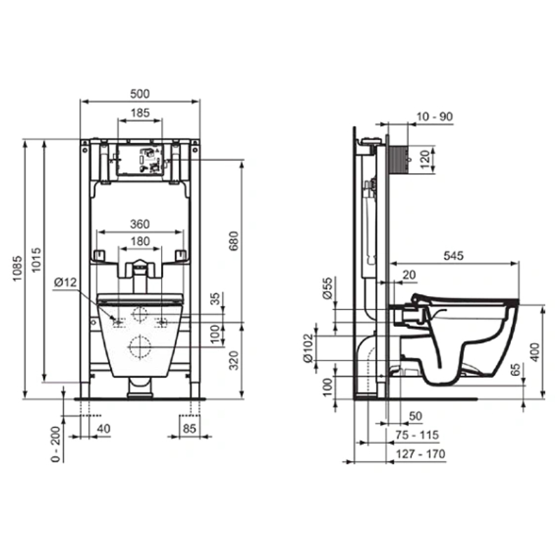 - For installation in front of a solid wall or between two light plasterboard walls according to the installation manual