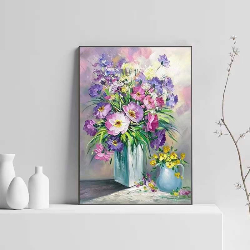 In the center of the painting, a large bouquet of daisies in delicate purple hues rises, spreading like a radiant cloud. The background is slightly blurred, with soft pastel tones that emphasize the brightness of the flowers. The composition inspires a sense of calm, beauty and freshness, bringing energy and harmony to the space.