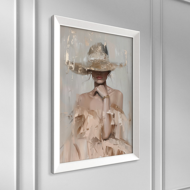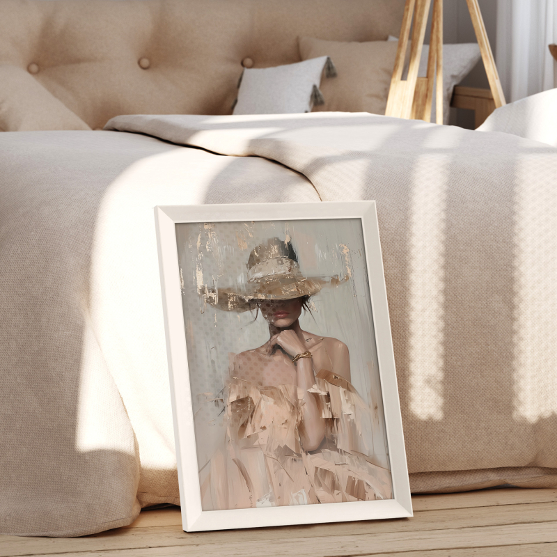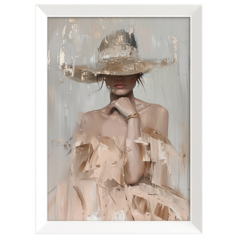 The painting PP032 Janet presents an elegant female silhouette in half-profile - a woman wearing a loose dress and a large brimmed hat that delicately hides part of her face. One of her hands is slightly raised to her chin, adding sophistication and a touch of mystery. The image is executed in soft, neutral tones of beige, cream, gray and gold, which radiate warmth and tranquility, creating a feeling of a fine balance between elegance and naturalness.