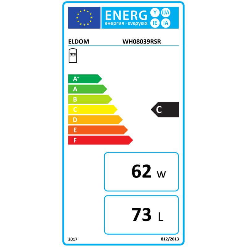 High-volume horizontal water heater WH08039RSR with a power of 2 kW and a capacity of 80 l of the ELDOM brand. With 1 coil. With connections for plumbing and electricity on the right side.