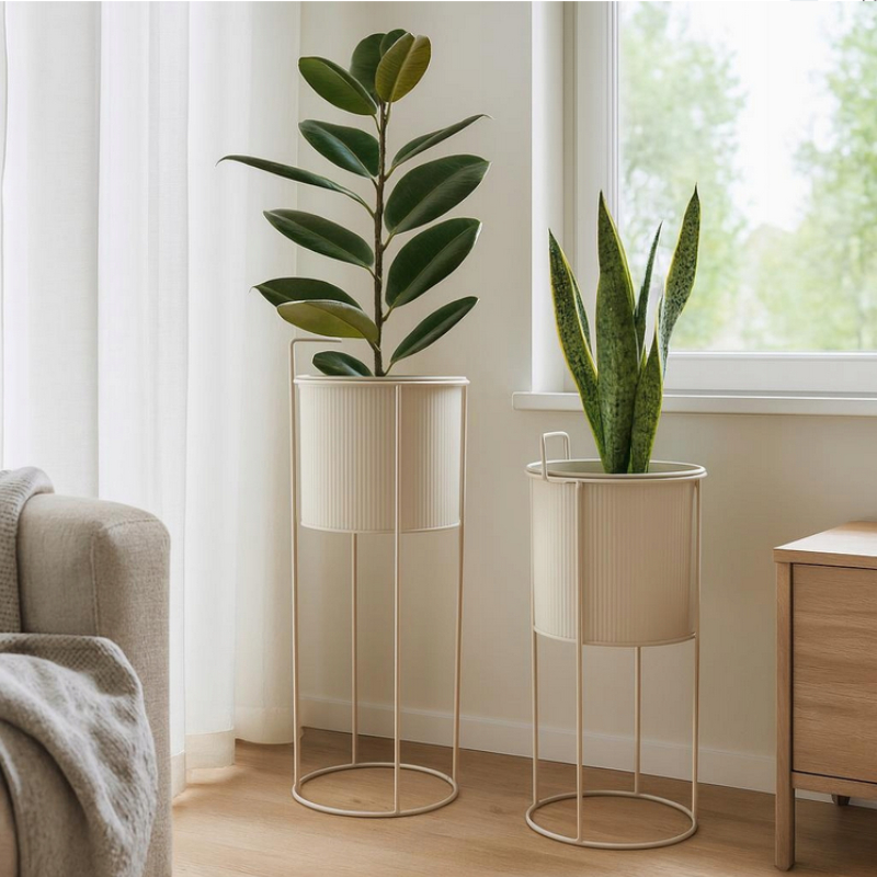 Made of quality metal, the pots are strong, durable and designed for long-lasting use. The matte beige finish gives them a clean and modern look that can easily be combined with different styles of furniture. Thanks to the lightweight construction and comfortable handles, the pots can be easily moved and rearranged according to the desired look.