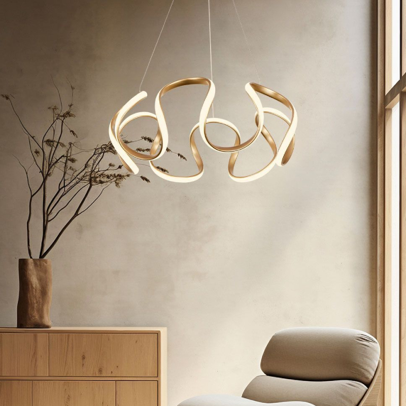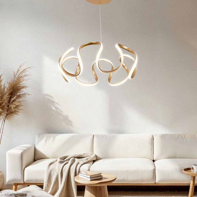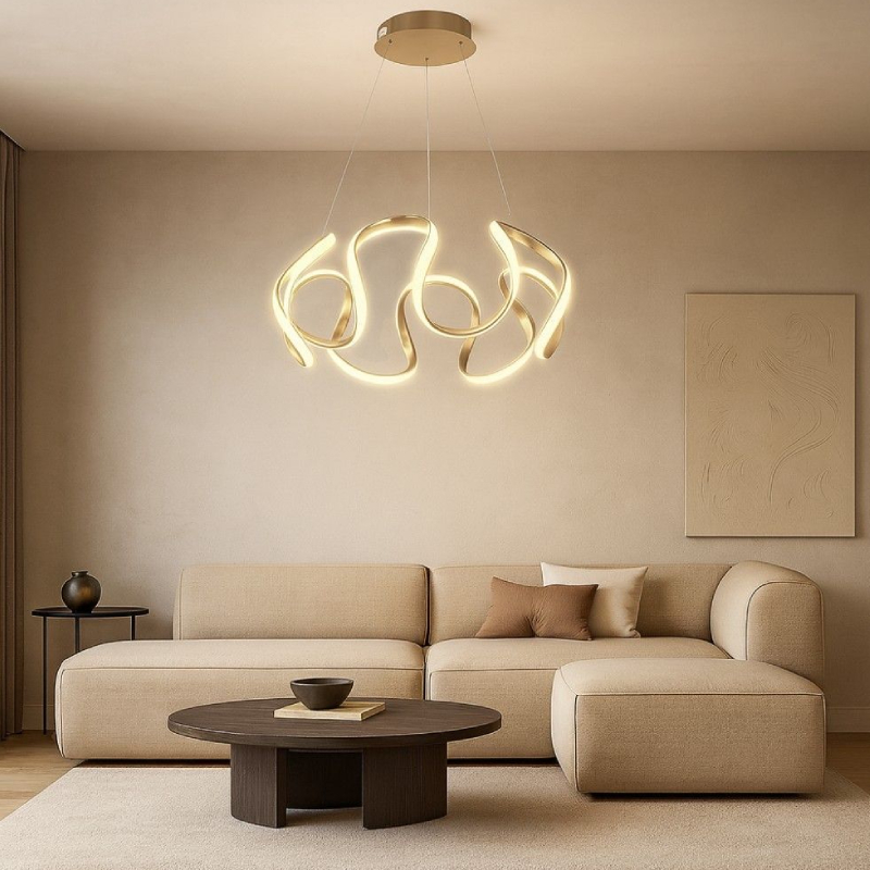 The MEANDRA LED pendant lamp by VIVALUX impresses with a modern look and elegant geometry, highlighted by smoothly curving lines in a stylish gold matte. Its design becomes an accent in any room, combining minimalism and artistry in one lighting fixture. The clean shape and spectacular LED radiation create a feeling of spaciousness and contemporary character, suitable for both home and representative spaces.