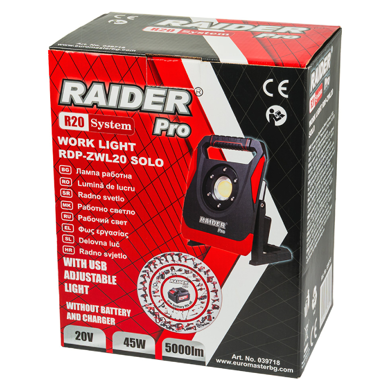 The model features a built-in dimmer for smooth adjustment of the light according to the specific task and environment, as well as a USB port for charging mobile devices. It is powered by a 20 V Li-Ion battery (sold separately), making it a flexible solution for professionals who already use the R20 system. The robust design with a comfortable handle and the ability to adjust the lighting angle ensures practicality and convenience in everyday work.
