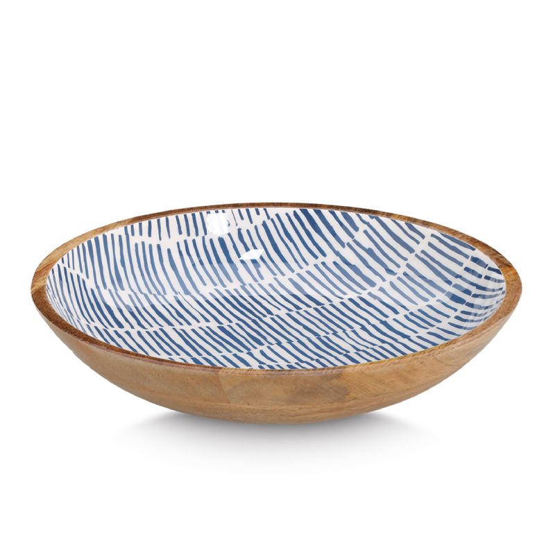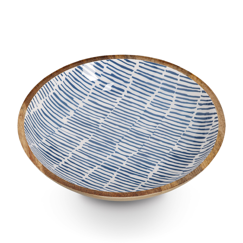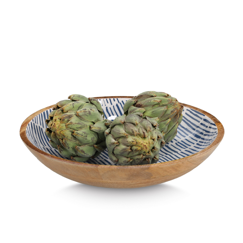 An elegant bowl with a modern design that combines the natural beauty of mango wood with a rich blue color. It is suitable for serving fruits, nuts or salads, as well as as a decorative accent in the kitchen or dining room.