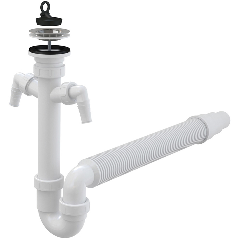 Sink trap with two attachments of the ALCAPLAST brand. It is made of high quality PVC material. The size of the siphon is ф50/40mm with stainless steel grate with size ф70mm and soft connection. There are two connectors for dishwasher and washing machine.