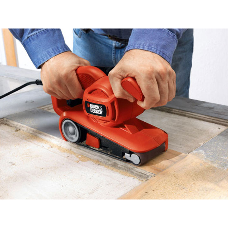 Thanks to its angular design, the Black & Decker belt sander provides twice as close sanding to the edge of adjacent surfaces, the powerful 720 watt motor makes the tool ideal for sanding floorboards, flooring and other large surfaces. Dust collection - dust released during operation is collected in a special bag at the back of the machine. Automatic centering of the sandpaper.