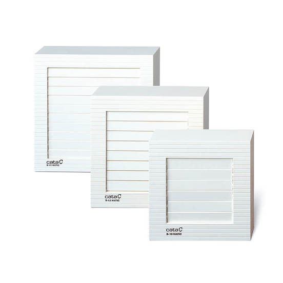 White plastic bathroom fan CATA with mounting diameter Ф 150 mm and flow 320 cubic meters/h. The overall dimensions of the panel are 210 x 210 mm, and the protruding part of it is 60 mm.The fan grilles open and close automatically. The noise level is 43dB.
