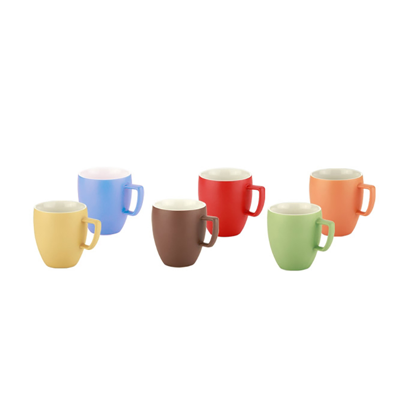 Porcelain hot drink glass Crema Tone. The cup is 10 cm high, 8 cm in diameter and has a capacity of 300 ml. Rich variety of colors: orange, light blue, yellow, brown, red and green. Suitable for microwave, dishwasher and refrigerator.