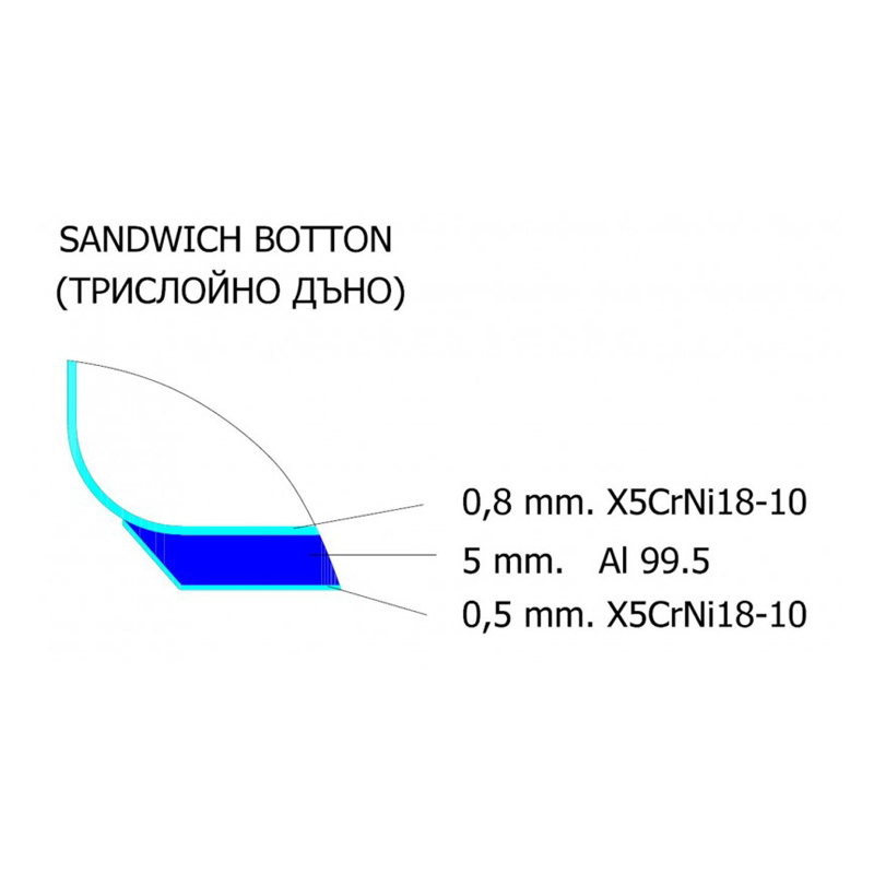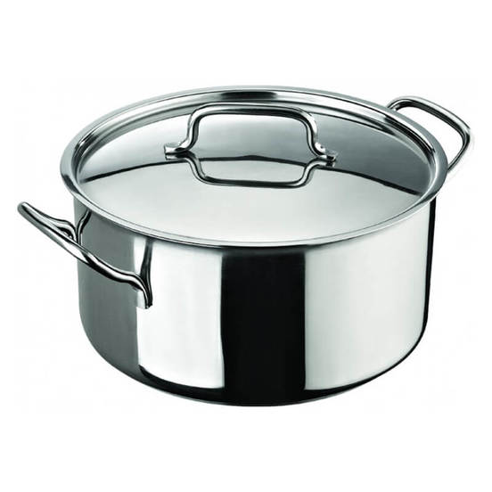 The pot from the Universal series of the CHROME SILISTRA brand. The pot has a diameter of 28 cm and a capacity of 10 liters at a height of 16.5 cm. It is made of stainless steel - noble stainless steel with a thickness of 0.8 mm. It has a three-layer bottom of the "sandwich" type with a thickness of 6.3 mm. The so-called "sandwich bottom" reduces energy consumption as it provides even contact with the heating plates.