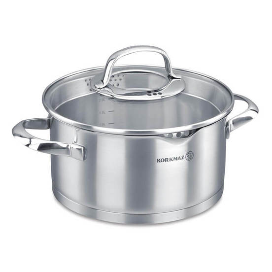 Steam pot from the KORKMAZ brand. The pot has a capacity of 5.5 liters and a diameter of 24 cm at a height of 12 cm. It is made of high quality chrome-nickel /Cr-Ni/stainless steel 18/10 with thickened bottom for even heating. It is equipped with a tempered glass lid. It has heat-resistant stainless steel metal handles. The pot has a perfectly polished surface for a more attractive look.