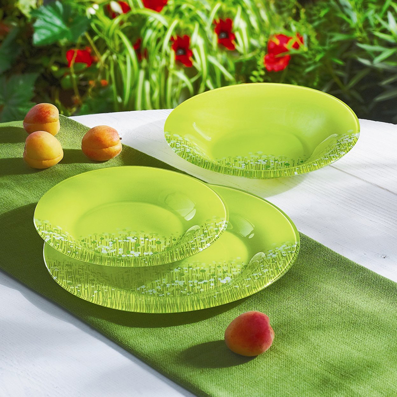 LUMINARC Flowerfield Anis dining set. Contains 19 parts made of tempered glass arkopal. Includes 6 main plates with a size of 25 cm, 6 deep plates with a size of 21 cm, 6 dessert plates with a size of 19 cm and a salad bowl with a size of 27 cm - light. A peace oven and dishwasher can be used.