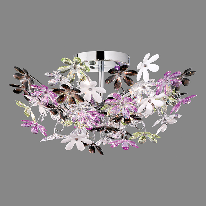 REALITY ceiling is made of metal in chrome color with a lighting part of acrylic, which is arranged with beautiful and colorful flowers. The luminaire has a degree of protection IP20. REALITY FLOWER ceiling is stationary and can be mounted on the ceiling as decorative or main lighting.