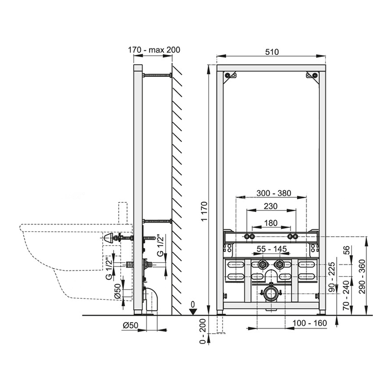 The product is an ALCAPLAST bidet mounting structure. The structural height of the structure is 120 cm. The surface is powder coated. The product is a self-supporting structure with a load capacity of up to 400 kg. It has adjustable fixing feet, compensating for uneven surfaces.