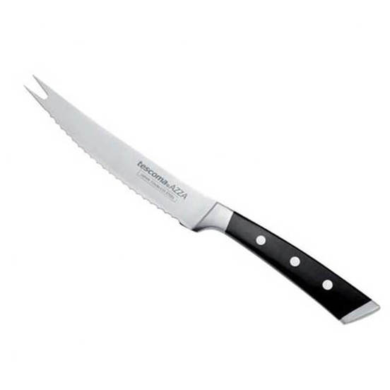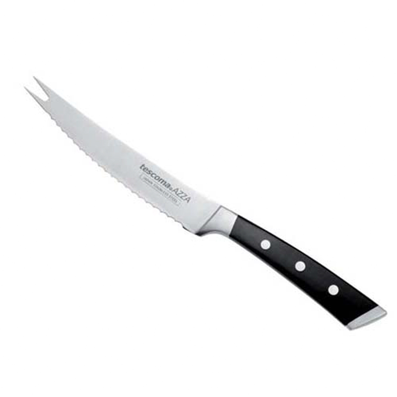 Vegetable knife from the Azza series of the TESCOMA brand. The knife has a blade length of 13 cm. The serrated blade is made of high quality Japanese stainless steel with a hardness of 55-57 HRC. The handle is made with ergonomic shape and solid steel rivets. The vegetable knife is dishwasher safe.