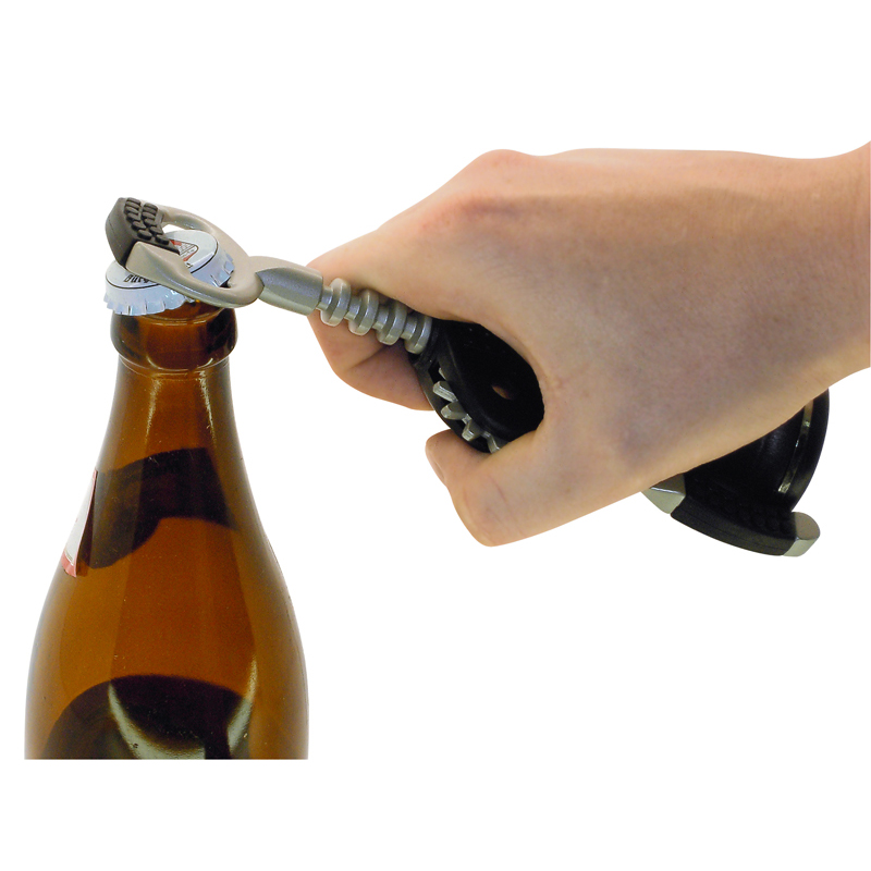 First-class corkscrew with lever mechanism of the FACKELMANN brand in silver-black color. Made of steel. The length of the corkscrew is 17.8 cm. In addition to its main purpose of removing corks from bottles, the device is designed so that at the other end it can be used as a bottle opener with metal caps.