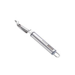 Peeler for fruits and vegetables from the Presto Expert series of the TESCOMA brand. The model has a longitudinal knife. The peeler is 16 cm long. The cutting work piece is made of high quality stainless steel, and the handle is made of plastic and is in an ergonomic shape for optimal grip. The device has a sharp spike, which will easily and quickly make decorations on fruits and vegetables or remove damaged parts of them. The peeler also has a practical hole for hanging.