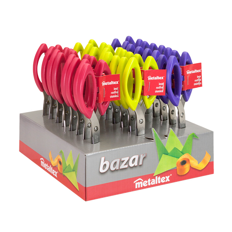 Household scissors from the Bazar series of the METALTEX brand. The scissors are 17 cm long. The cutting parts of the device are made of stainless steel /stainless steel/and the handles are made of plastic.