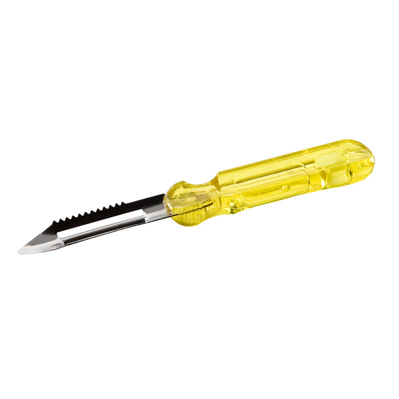 Peeler for fruits and vegetables of the SUNPLAST brand. The model has a longitudinal knife. The cutting work piece is made of stainless steel and the handle is made of plastic. The device has a sharp tip, which will easily and quickly make decorations on fruits and vegetables or remove damaged parts of potatoes. The model is in neon color.