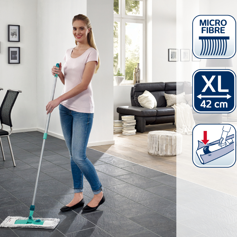 The mop is ideal for basic cleaning. It is equipped with clips that allow the replacement case to be changed quickly and easily. The microfiber cover absorbs dirt and water very well. Its width is 42 cm. In addition, there is also a rotating mechanism, which is very convenient for undulating and uneven surfaces. Thanks to the telescopic breakable handle, you can easily clean under the furniture, and its length is adjustable from 75 to 130 cm.