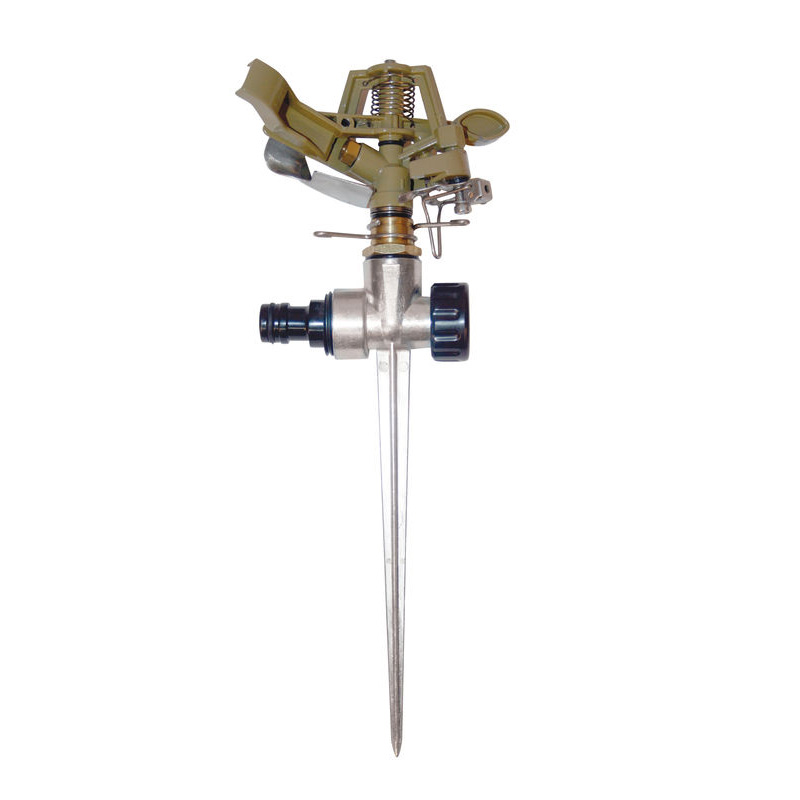 Metal impulse sprinkler of the TOP GARDEN brand. The model has a spreading range of up to 26 meters. It has a function for adjusting the direction of spreading.