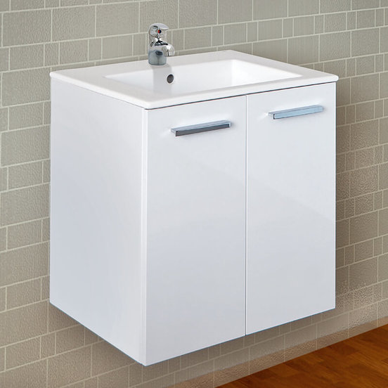 Waterproof PVC bathroom cabinet with porcelain sink from the Glory series of the GURTSOV brand. The cabinet measures 55.2 x 42.7 x 56.5 cm. It has two doors. It features a white glossy finish. It is intended for hanging/wall mounting.