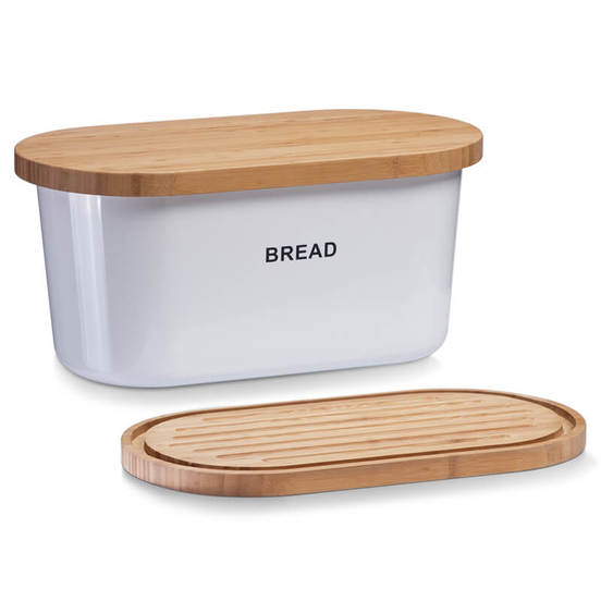 ZELLER bread storage box with dimensions 39 x 23 x 18.5 cm. It is made of white melamine and bamboo wood. The material is resistant to wear, impact and dirt. The bread box features a stylish and practical design. It does not take up much space and fits in a great way in the interior of any modern kitchen. The lid of the box can also be used as a bread slicing board.