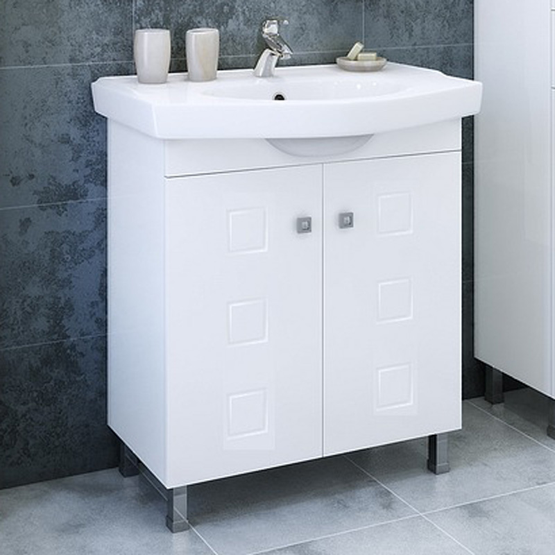 Moisture-resistant MDF bathroom cabinet with porcelain sink from the Veni series of the VISOTA brand. The cabinet measures 75 x 51 x 86 cm. It has two doors. It is intended for free-standing installation on legs that are adjustable in height. It is distinguished by a white glossy finish.