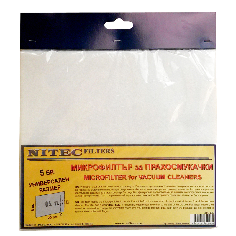 NITEC universal microfilter for vacuum cleaners. Available in a set of 5 pieces. The microfilter measures 18 x 20 cm.