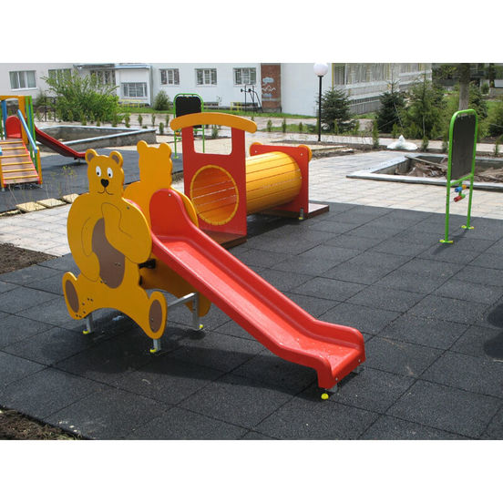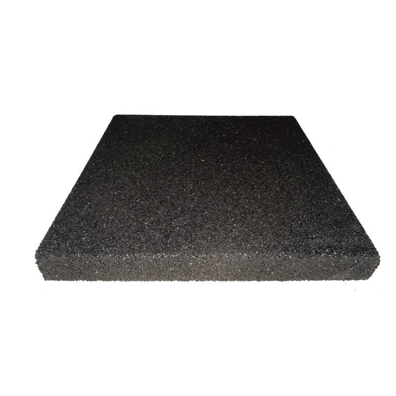 Shock-absorbing black EPOS rubber flooring with dimensions 400 x 400 x 40 mm. Intended for securing children's and sports grounds, gyms, garages and overpasses, balconies and terraces, production premises, stations and gas stations, alleys and bridges, shooting ranges, as well as around swimming pools and jacuzzis.