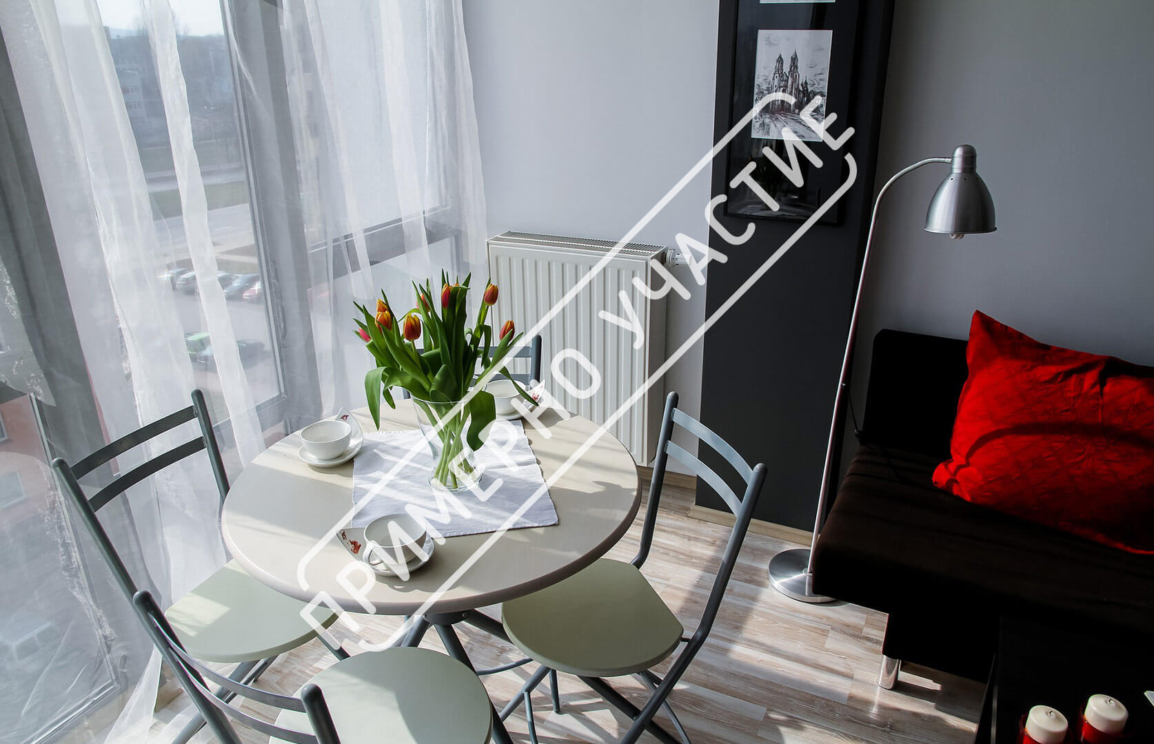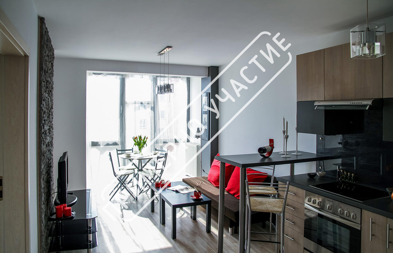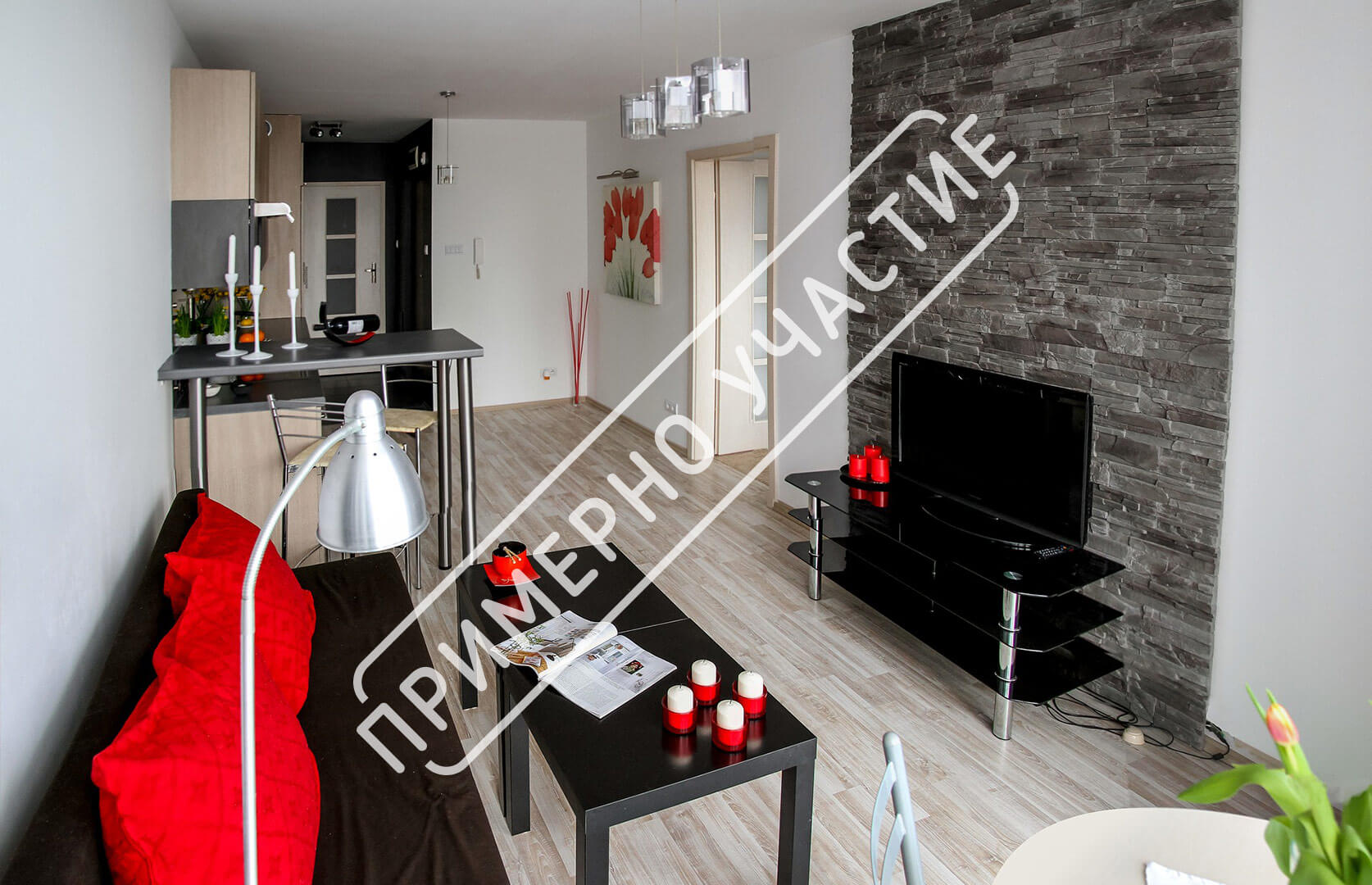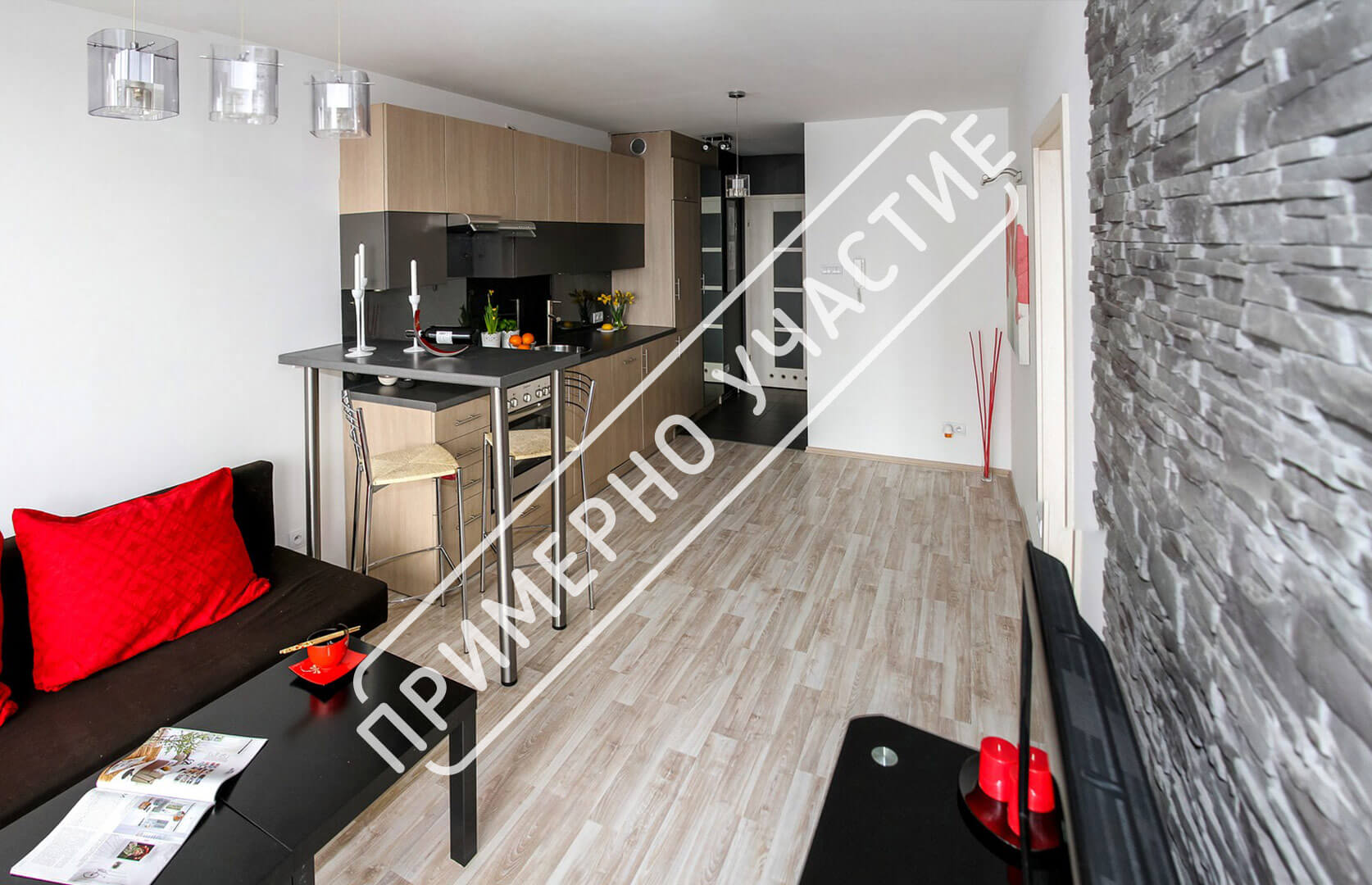 Като всеки нов проект, и този започна с тотално разчистване на терена. Всичко беше подчинено на печеленето на повече жизнено пространство. Освободихме стаята от голямото легло, което беше колкото удобно, толкова и завземащо територия. Елиминирахме и тежката мебелировка, която също изяждаше голяма част от жизнения периметър. Сменихме ламинирания паркет, като на мястото на тъмния поставихме светъл пак в името на усещането за по-голям простор. Много важна стъпка към постигането на целта беше усвояването на терасата, където си оформихме кът с маса и столове. Оформихме стилен и компактен кухненски блок с функционални шкафове и барплот с високи столове. За по-голям уют едната от стените декорирахме с пано-имитация на камък. Под тази декорация разположихме масичката с телевизионния приемник. Точно срещу него поставихме малко канапе с холна масичка. Подсилихме осветлението с допълнителни тела не само от тавана, а и по стените.