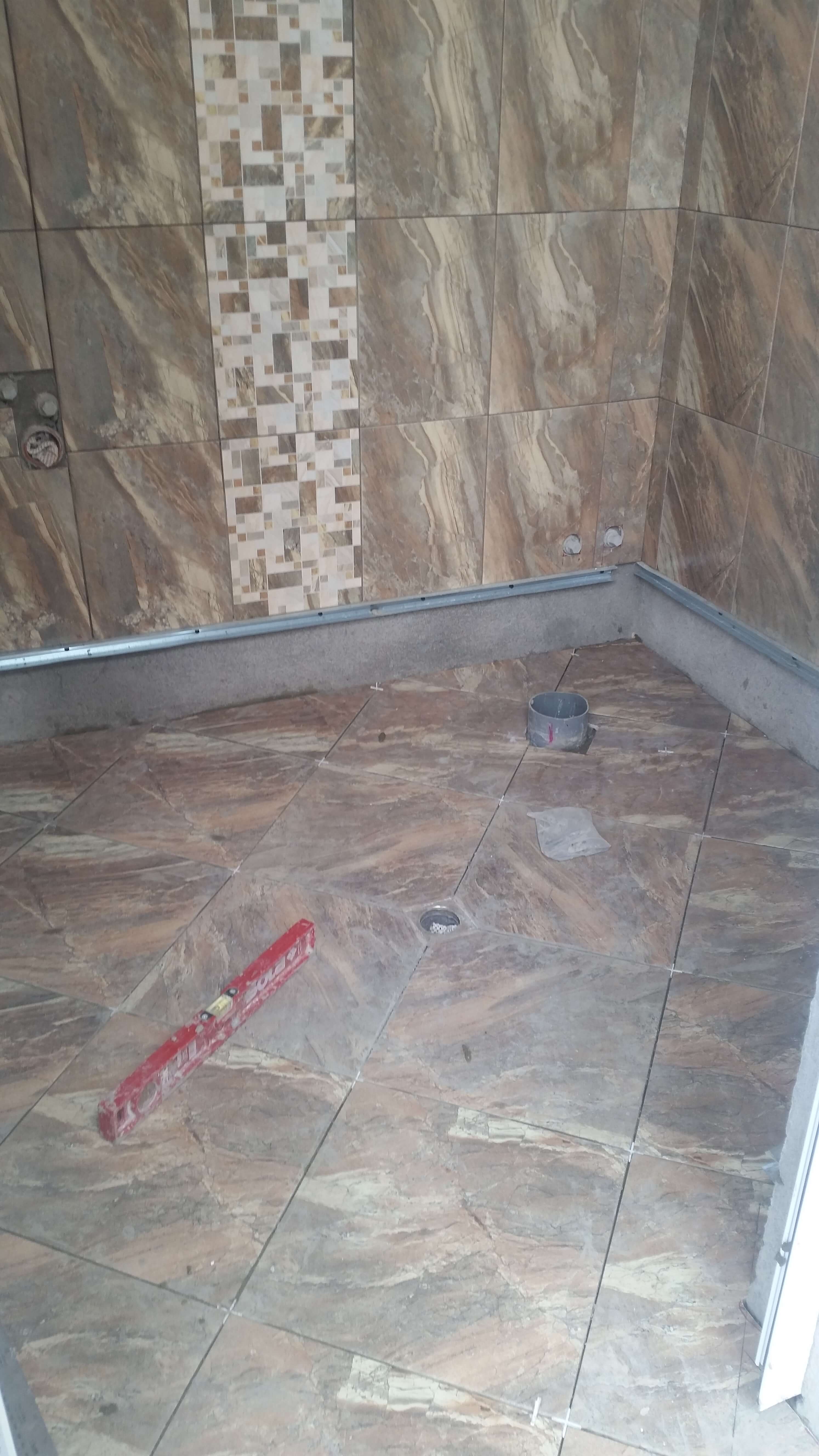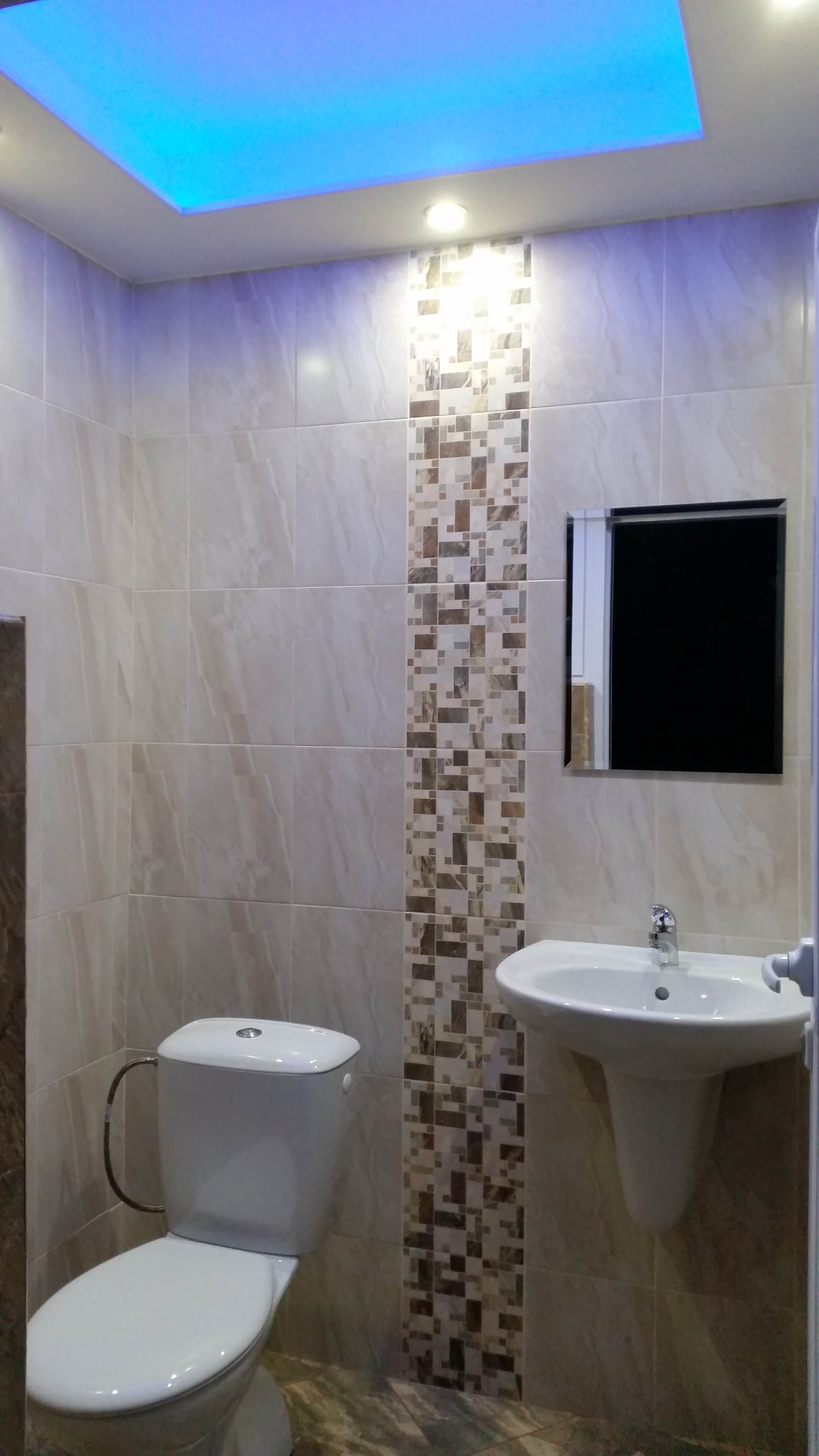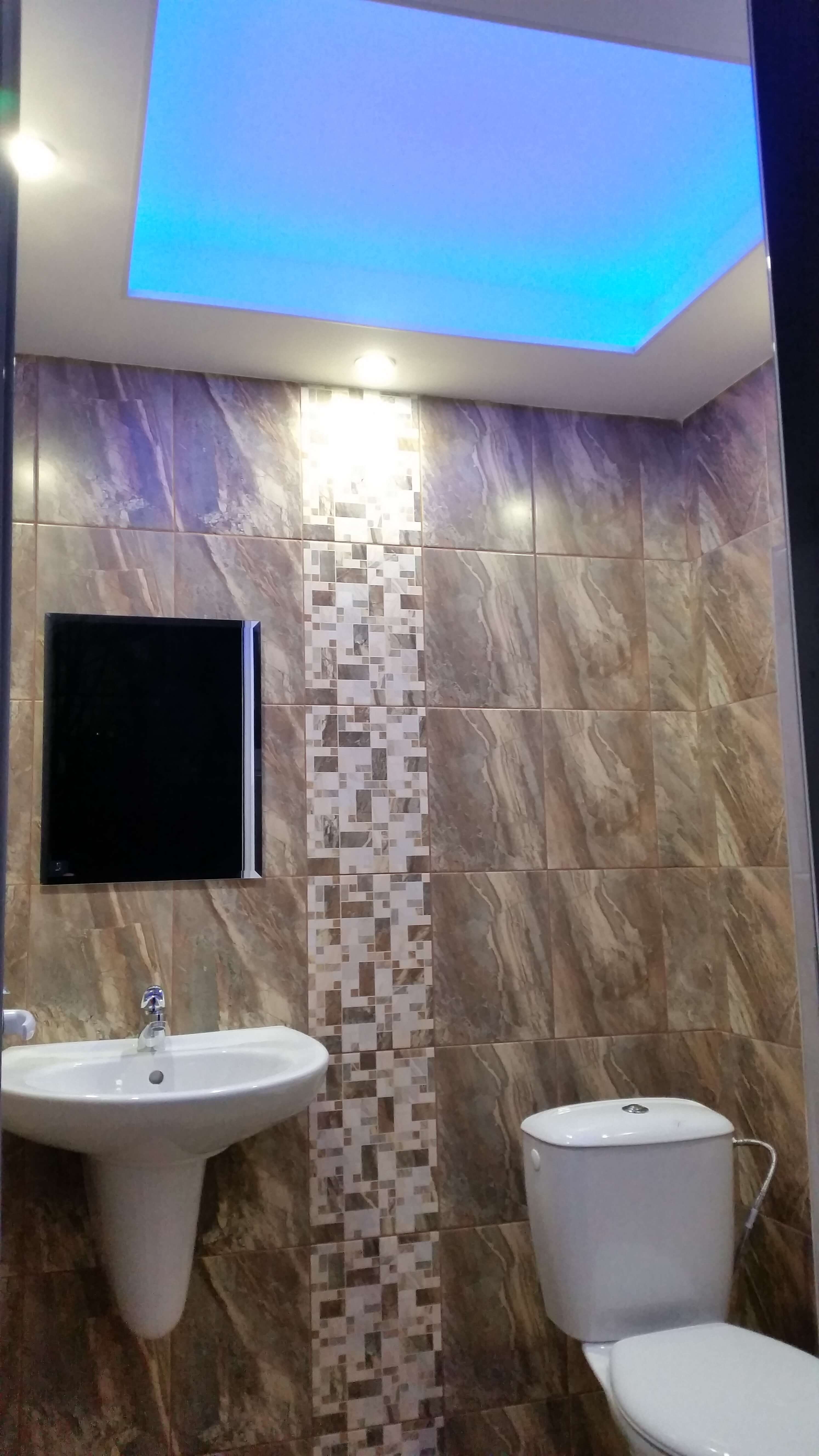Цялостна реновация и освежаване на съществуващи WC ( мъжка и женска). Смяна на старите железни тръби, нова канализация, плочки, моноблок, мивка, дограма, аксесоари за баня. Изграждане на окачен таван с лунички и RGB LED осветление в комбинация с цвета и подредбата на фаянсовите плочки успях да постигна желания ефект да се оптимизира малкото пространство от 3 кв.м. да изглежда просторно, уютно и да е функционално.