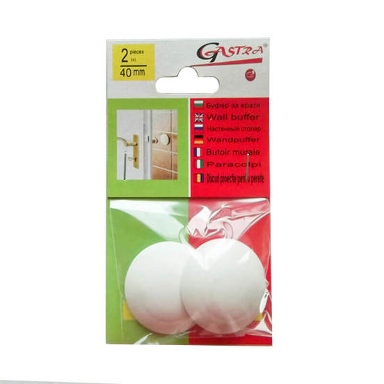 Дверные отбойники GASTRA диаметром 40 мм белого цвета, по 2 шт. в упаковке. Их размещают на стене, чтобы защитить ее от дверной ручки при открывании.При этом буферы являются защитой не только стены, но и самой дверной ручки от повреждений при ударе.