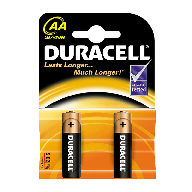 2 щелочные батарейки DURACELL AA MN 1500 K2 с напряжением 1,5 В на каждой из батареек.